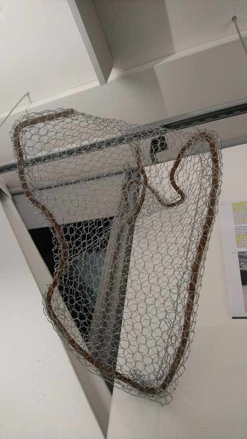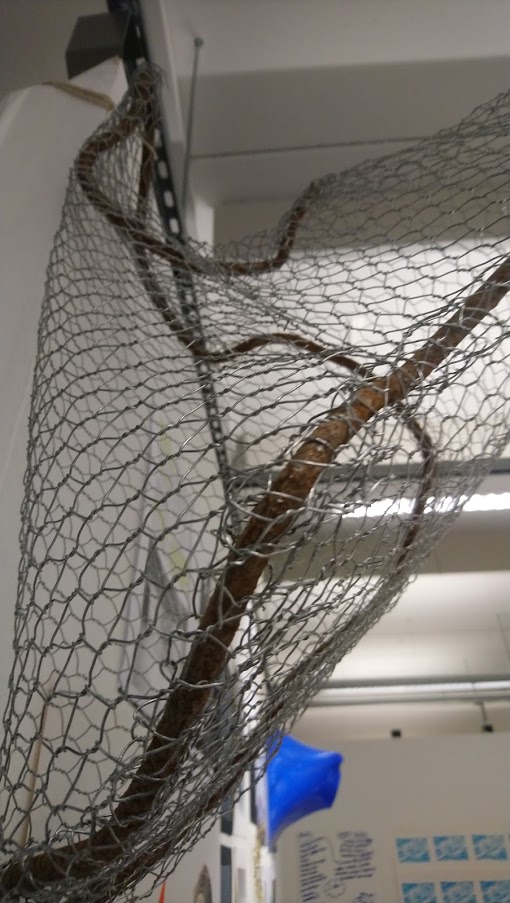 Once the chicken wire is cut and bent around the frame, it is possible to change which planes meet. There was a lovely bend which followed the edges so I might want to use a flexible material rather than cast the objects as a solid. It is quite interesting in form because of its transparency – this is my first experience with chicken wire and I think it has helped me to imagine the four sides of the object which is always the difficult part of making a sculpture. I hung it to view it and think about the next stage as I don’t feel it has a front or back, it exists as an idea and is beginning to take shape.