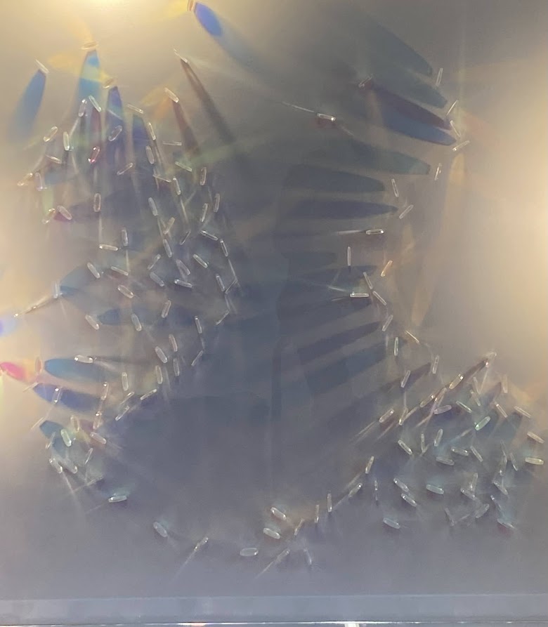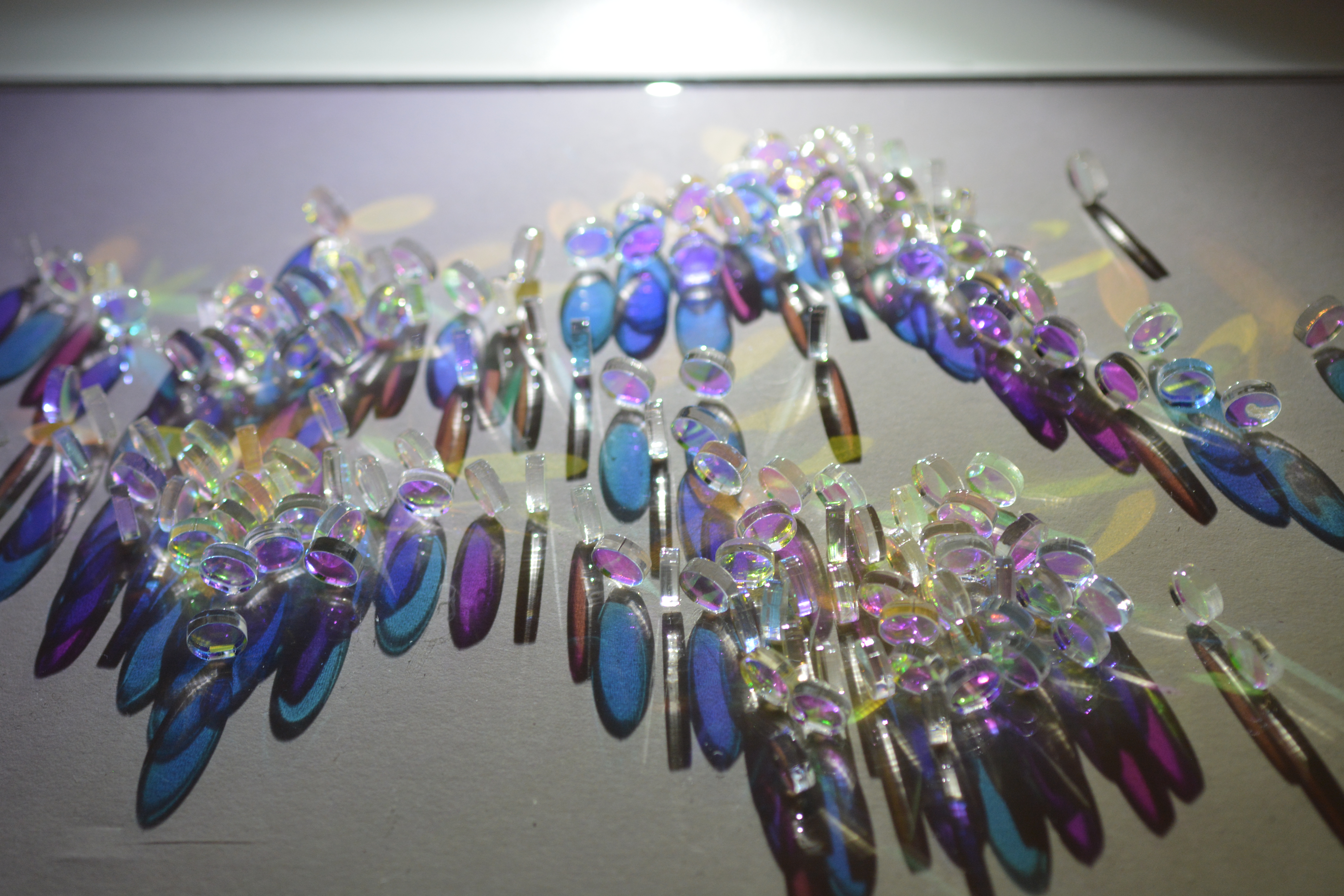 Feeding off the vivid hues of dichroic acrylic and utilising the angles of small pieces cut to size on the laser cutter I placed them onto a background and the work took shape. By employing a transparent canvas, their soft colours manifested more prominently than when placed against a dyed backdrop. It was at this point I could imagine the finished piece. Drawings and prints helped me to consider the shapes that the birds make without being too representative.