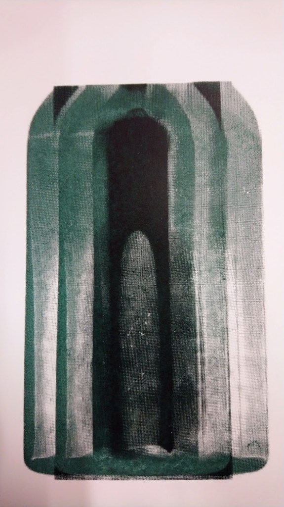 Work on this print produced many different copies each with its own meaning. The repetition of the shape was reminiscent of the arches and domes of he architecture of Venice and the black/dark green acrylic created a feeling of sadness at the loss of this. The layers of luminous paint created a feeling of alert and danger. I used red over the black to emphasise this. The harder I pushed the paint through the silk screen the denser the image became. The less dense ones showed clearly the shadows and edges of the bottle.