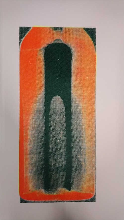 It was interesting to try a 100 mesh screen as it seemed to collect finer detail but also created a wave of lines from the photogram that I did not anticipate. This created a different texture and feel to the print and one that I personally liked. However the bright orange of the one that I chose for the exhibition is a call to action to address the issues of rising sea levels and the loss of priceless architecture and art in Venice.