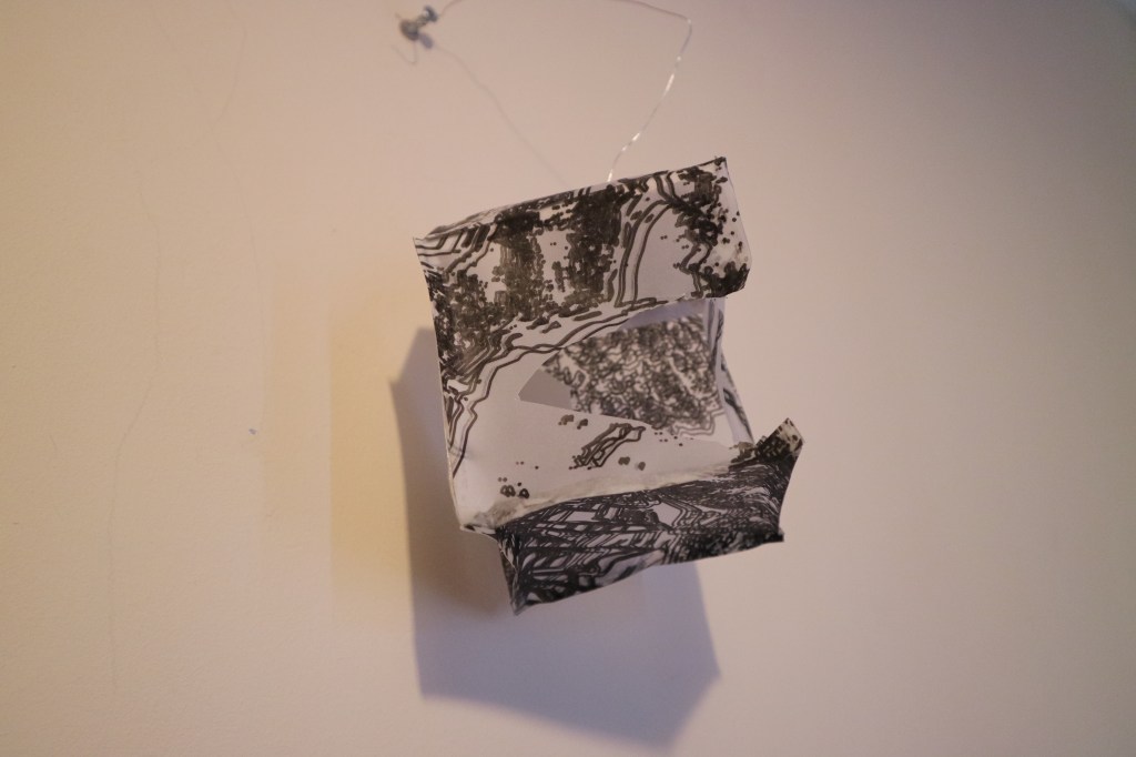 Printed tracing paper formed into a cube and suspended