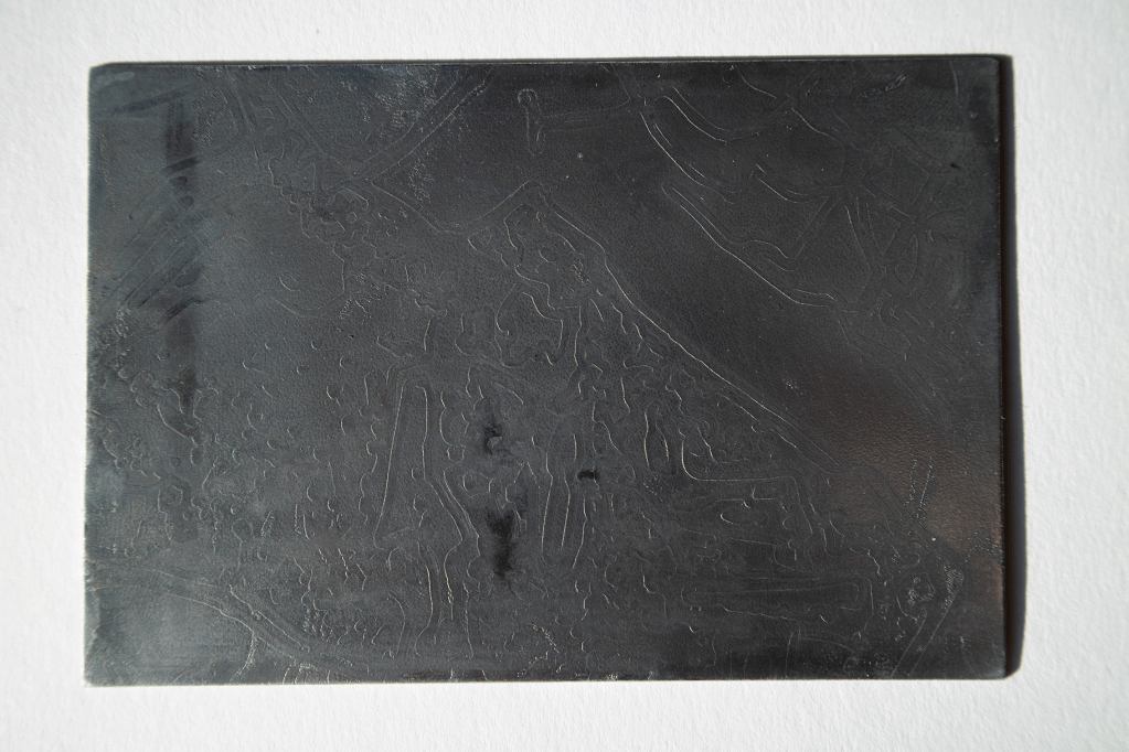 12 cm x 8 cm An open bite etching made with a screen print with a view to making a larger one and manipulating the zinc for the sculpture.