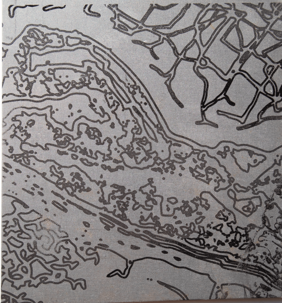 Screen Print on steel with a view to marking the lines with metal objects to create indentations.