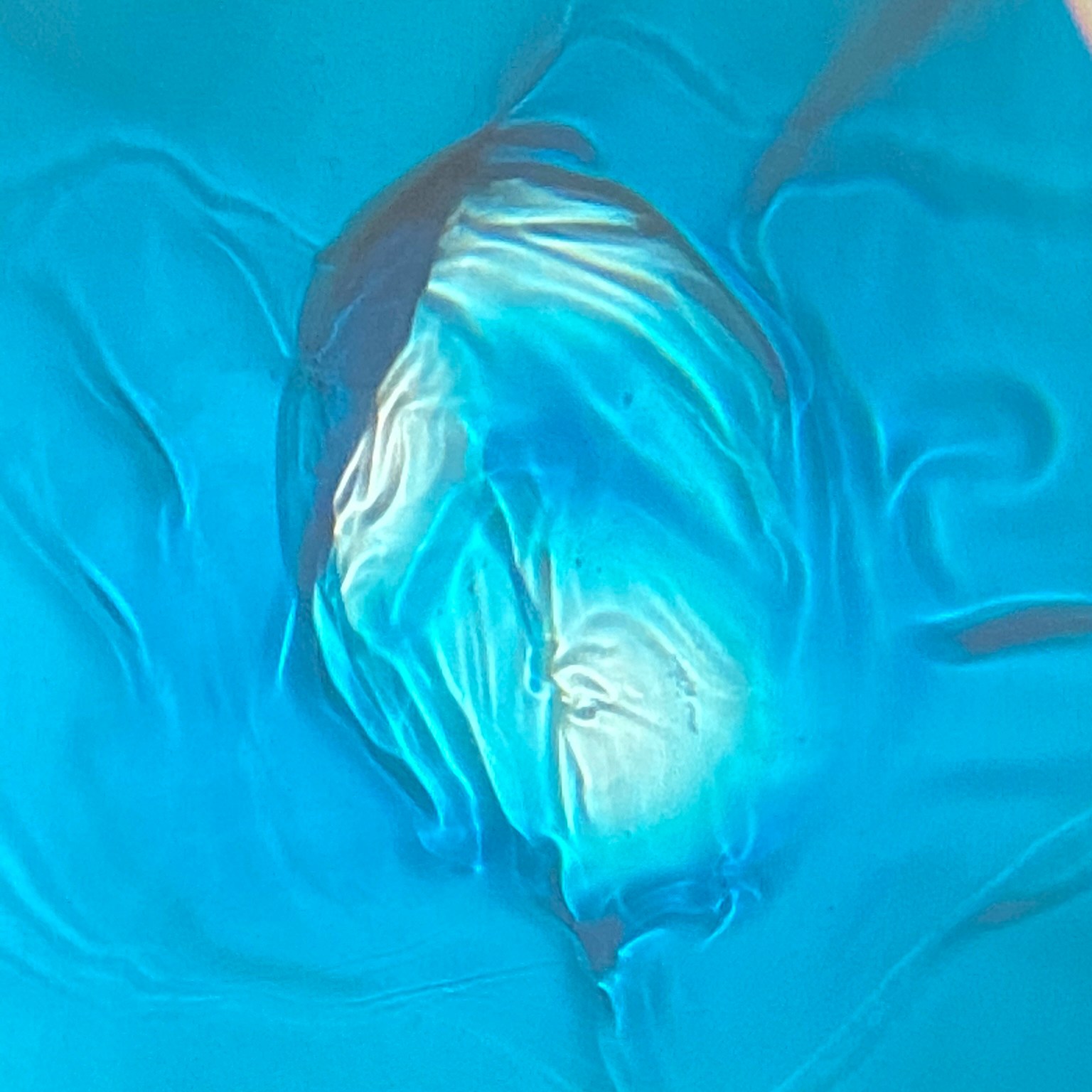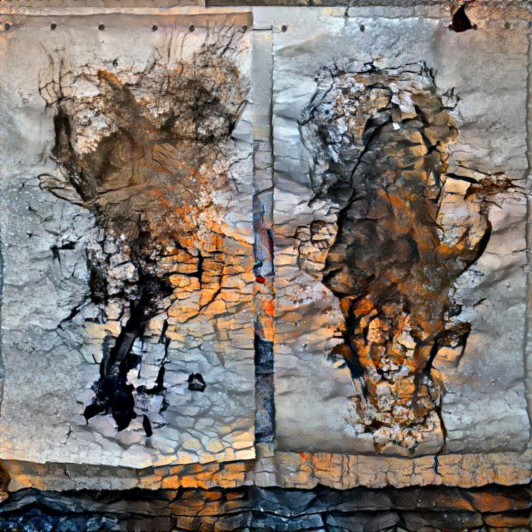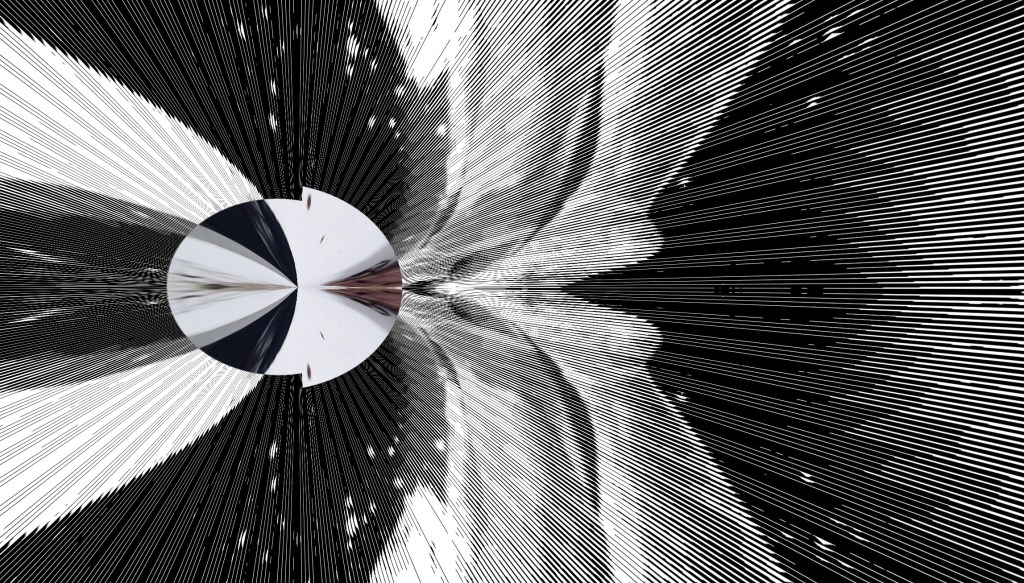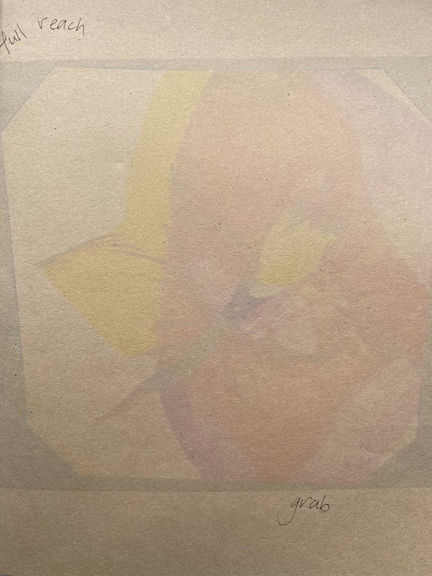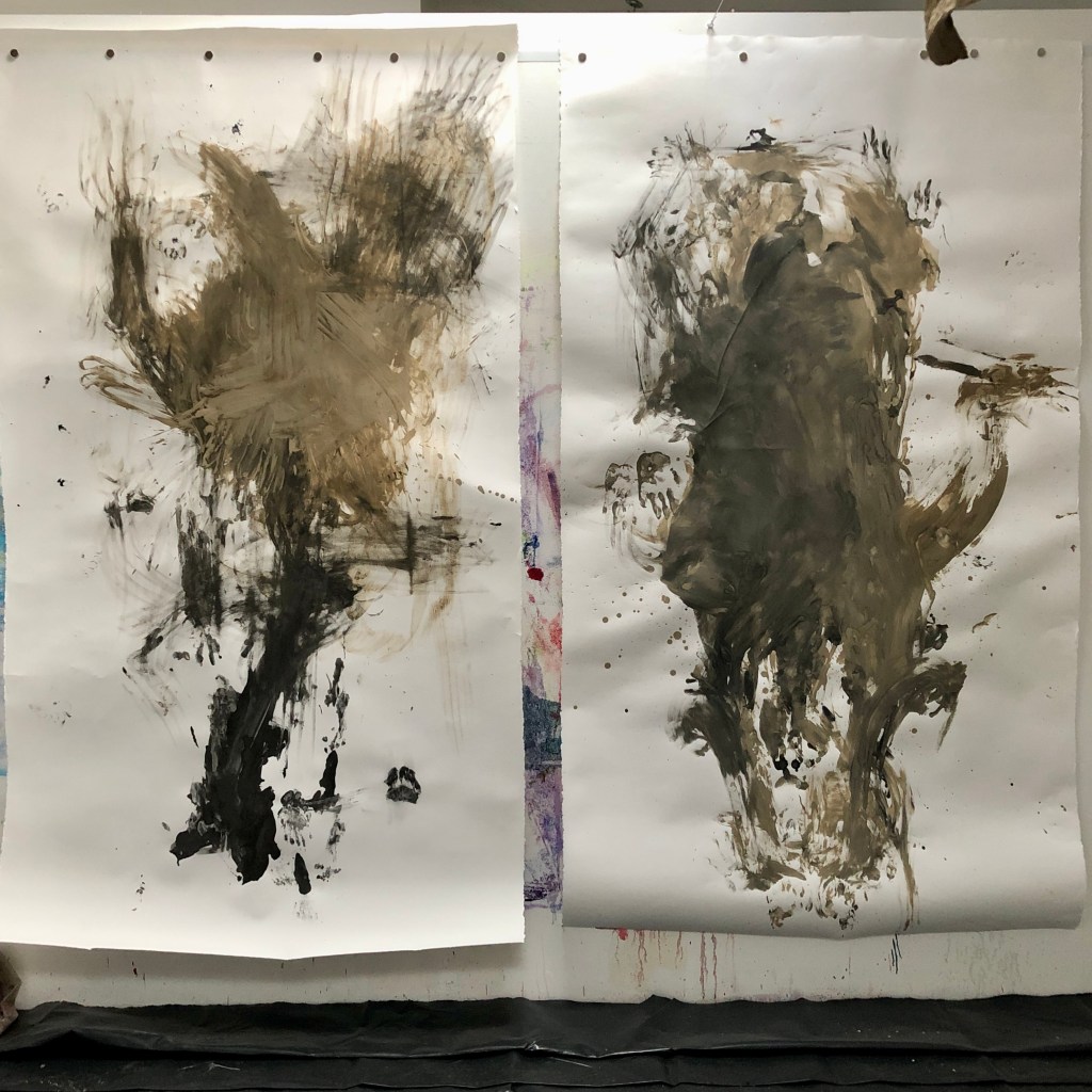 My practice explores both online and off line processes to discover what it is I am moved by in a subject. Using mirroring and glitching, I first abstracted the images of HA as she worked in clay viscerally and emotionally, ‘from my first understanding of the process. I felt your pain and saw the acts in the photos as two separated forms in one action, making an effort to reunite‘. This and the influence of Jasper Johns process, exploring the same subject in many mediums and the use of mirroring was a starting point. The subject is a whole body and mind traumatic event and yet a life lived in the shadow of it has created a dualism? One part still and the other seemingly moving necessarily through time, carrying a time bomb/cocoon.