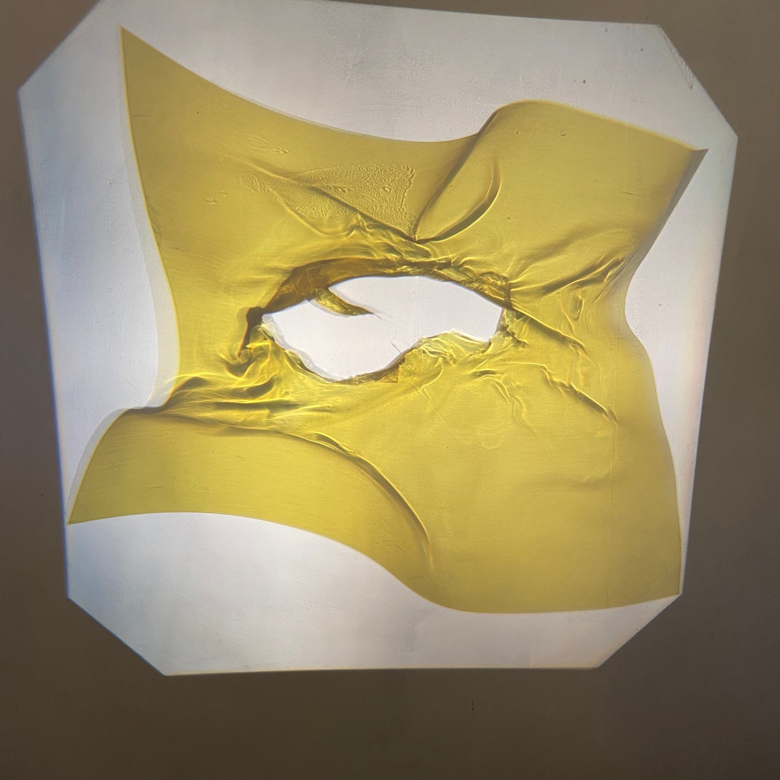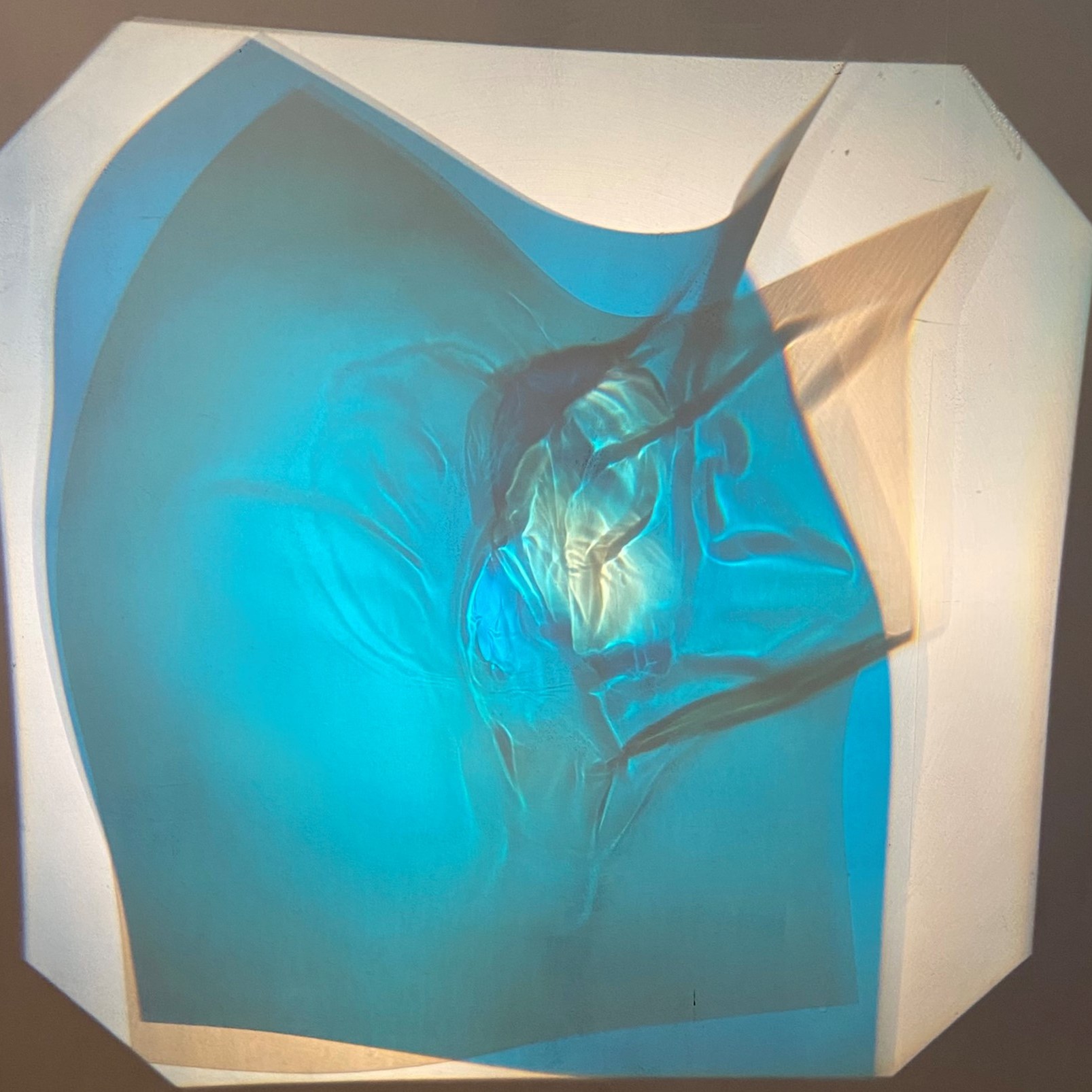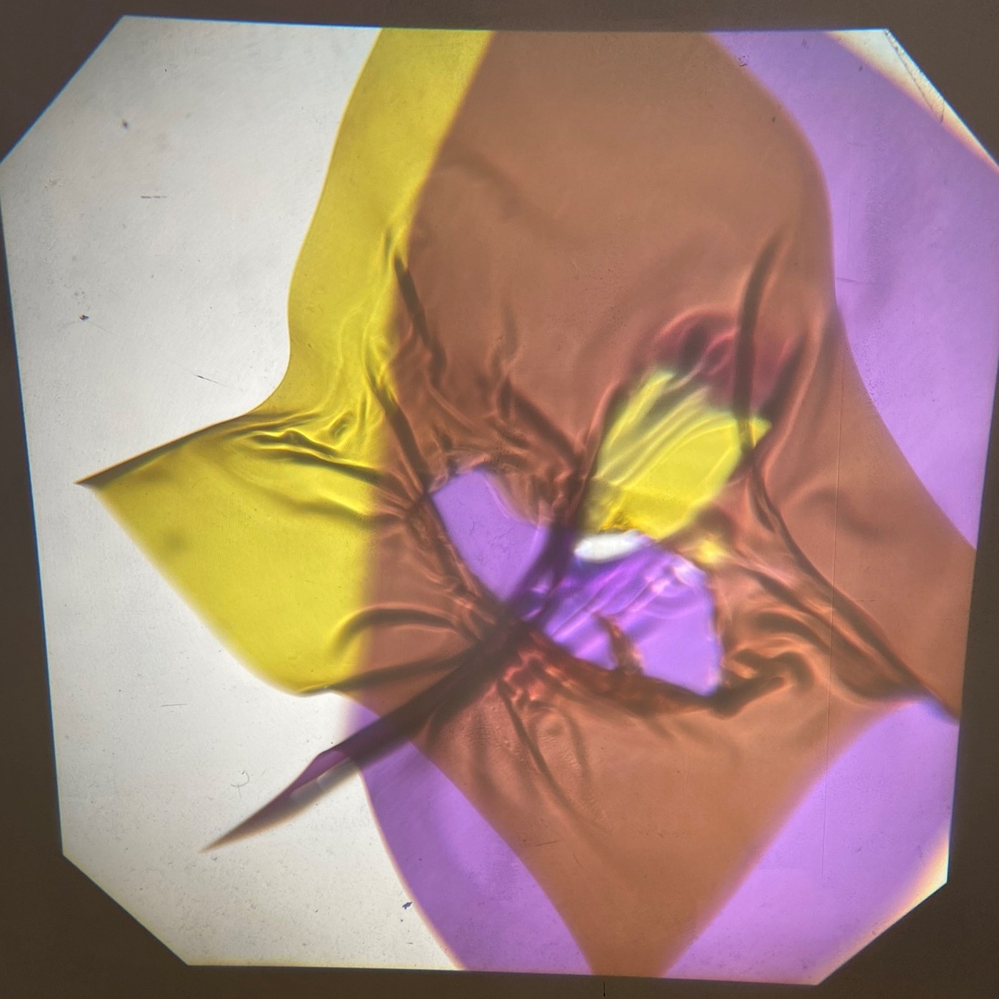 In my own practice I had begun researching a nearby reservoir formed in the 1930’s when a village of 300 residents had to vacate the Watergrove village to make way for the reservoir. Using acrylic sheet, I was melting tears and rips, creating small sculptural statements, layering them and projecting them with light. This process worked well with the theme of a exploring the moment when we are taken back in time to an event eliciting a physical response. (Below) I went on to animate some of these, although sharp images were difficult to capture as they were as the projections were as large as the studio wall.